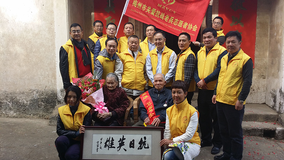 梅州市關愛抗戰老兵志愿者協會成立后,大力開展尋訪散居梅州山鄉的抗戰老兵,為尋訪到的每位抗戰老兵舉行民間簡樸又莊重的“贈章授榮”儀式、為困難老兵提供基本生活保障、為抗戰老兵提供日常生活照顧、為老兵過生日、重大節日慰問、生病看望看護、為抗戰老兵留影留聲、留手印,歸隊致以哀榮等等關愛活動,以熱心和誠心,為抗戰老兵送去“遲到的榮譽”和慰藉。經協會理事會研究,決定對抗戰老兵進行日常關愛的同時,給幸存抗戰老兵每月500元的致敬金。通過發放關愛金和致敬金,使老兵每月能獲得1100元的生活保障。20149月至20185月,廣東省雁洋公益基金會發放葉劍英基金關愛金380多萬元,協會動員社會各界熱心人士和志愿者38600多人次,行程逾10萬公里,為抗戰老兵發放致敬金及其它慰問金等700多萬元,為抗戰老兵發放御寒物資一大批、保健品和日常生活用品、慰問品一大批,為住院就醫的抗戰老兵送上慰問金和輪值守護陪伴,累計為300多位梅州抗戰老兵及老兵遺孀,廣東以外800多位抗戰老兵及老兵遺孀送上了最真摯的關懷。